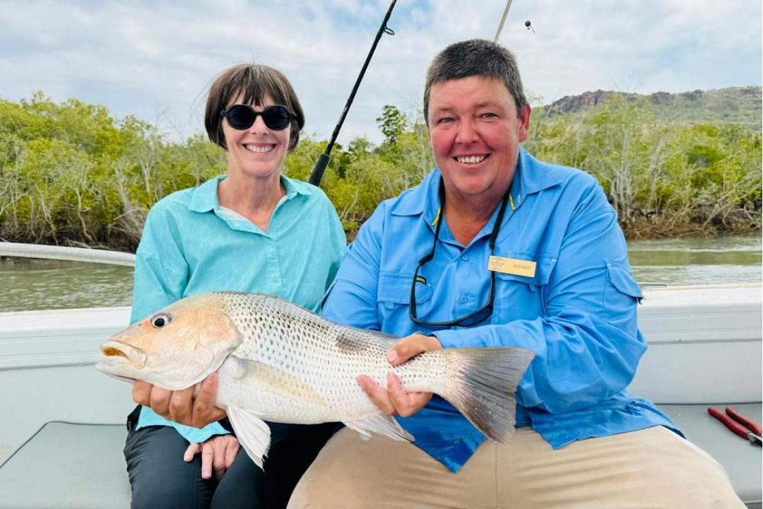 The adventure culminates in a shared gourmet lunch back at the lodge, where the days catch is prepared by our chefs and served with thoughtful accompaniments. Fresh fish, grilled to perfection, is paired with seasonal sides and premium local wines, a barefoot feast enjoyed in the open air with fellow guests. For novices and seasoned anglers alike, its the perfect blend of adventure, flavour, and Kimberley connection.