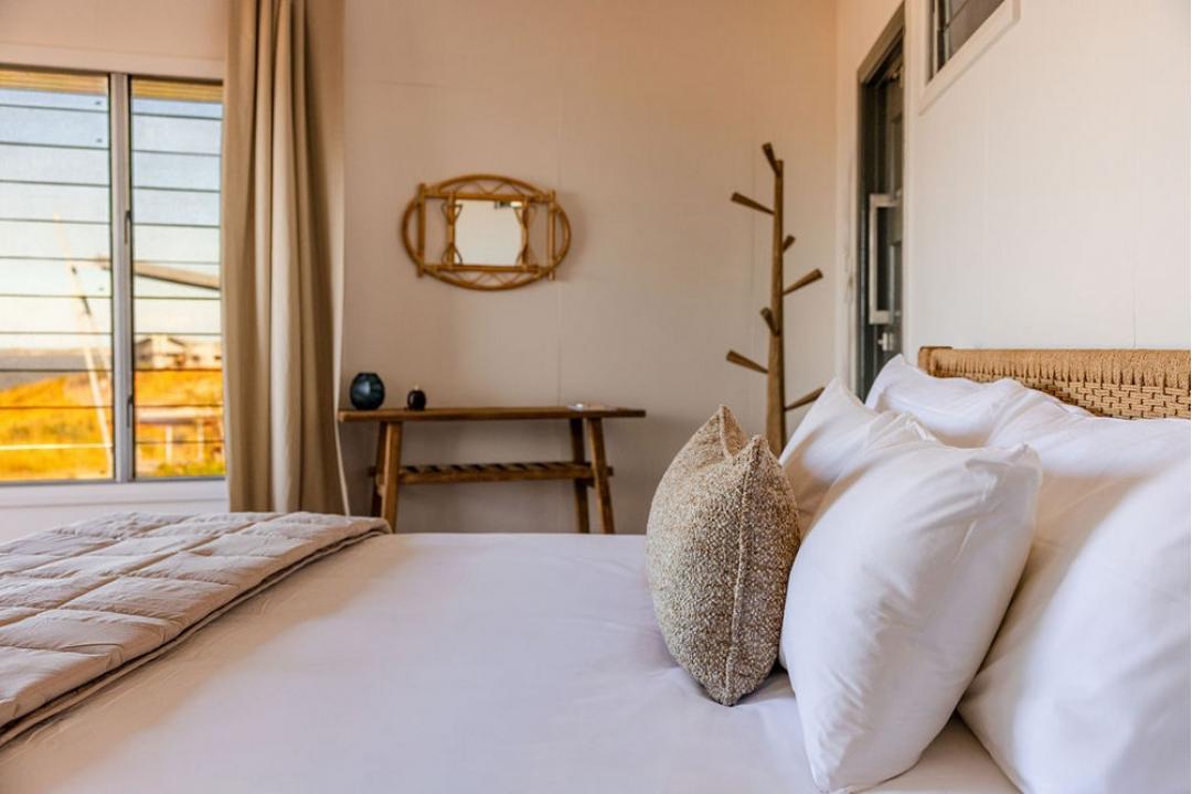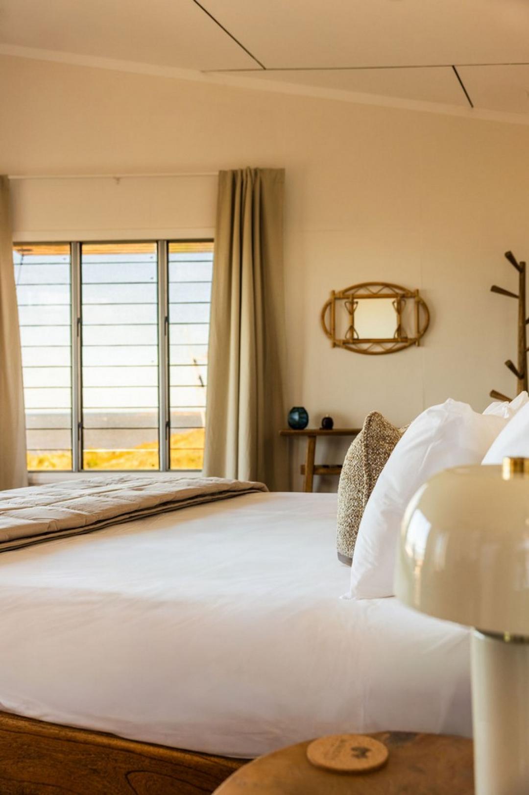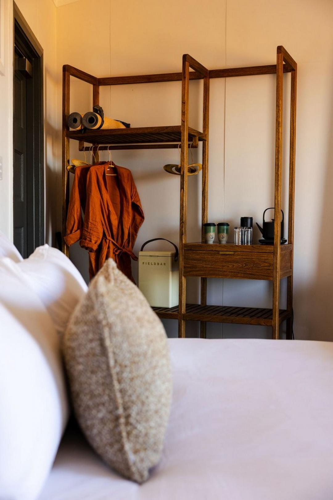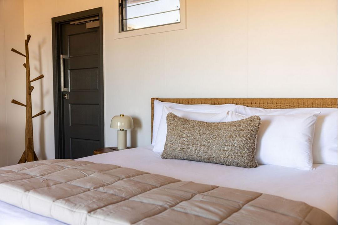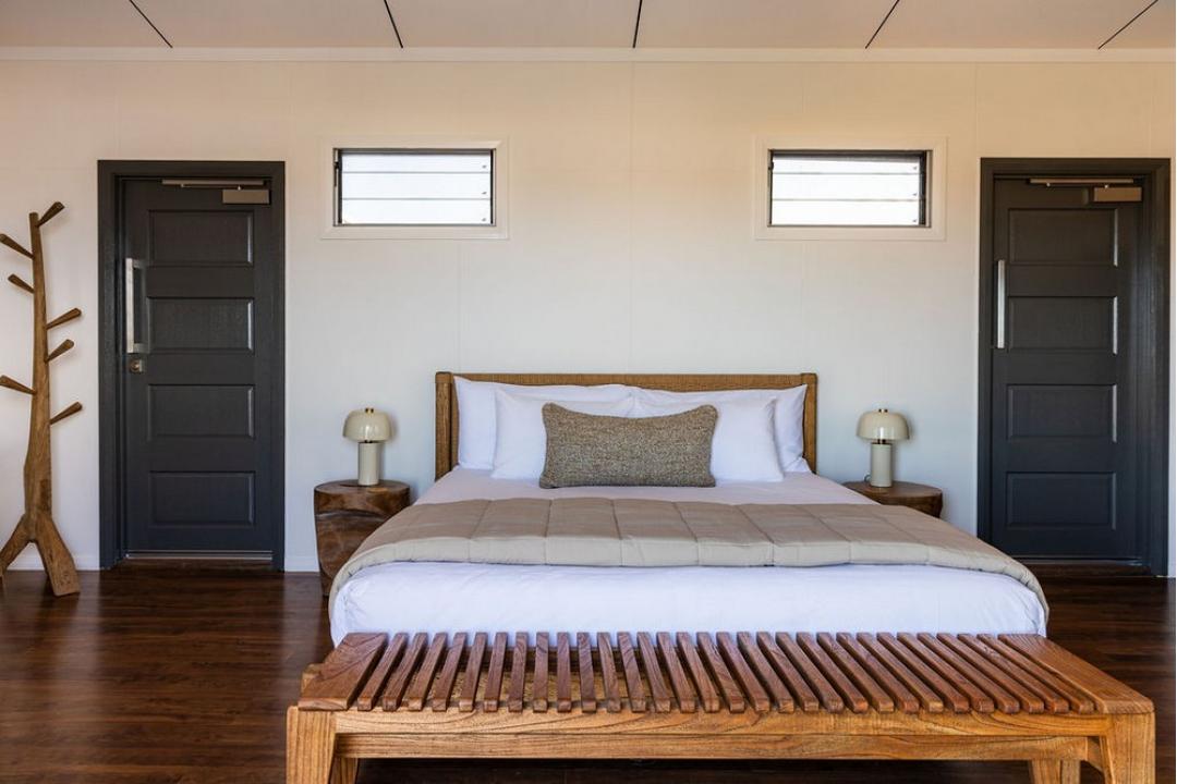 Inside, a sumptuous king bed (or twin configuration on request) rests, layered with custom linen and soft natural textures. The cool, air-conditioned interior features bespoke teak and rattan pieces, Italian hide rugs, and curated lighting, balancing barefoot comfort with refined luxury.Your open-air ensuite invites indulgence, with dual vanities, a rain shower, and a striking freestanding bathtub set beneath the stars an invitation to soak under the Kimberley moonlight.
