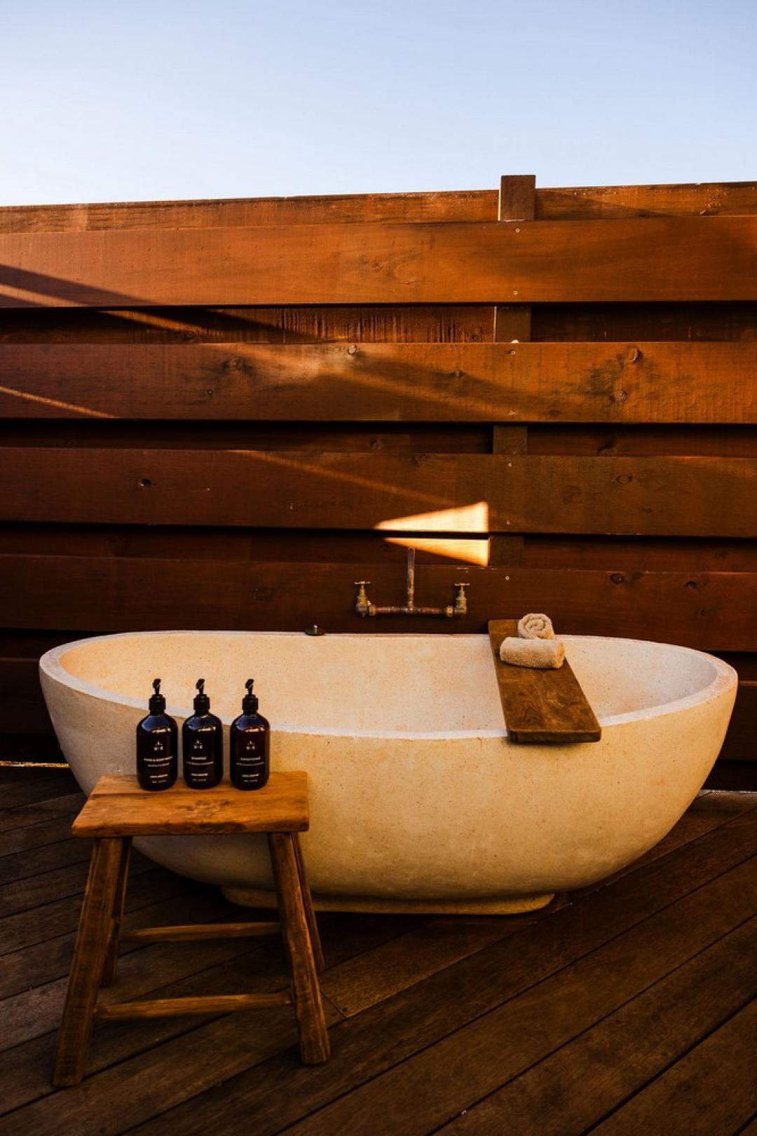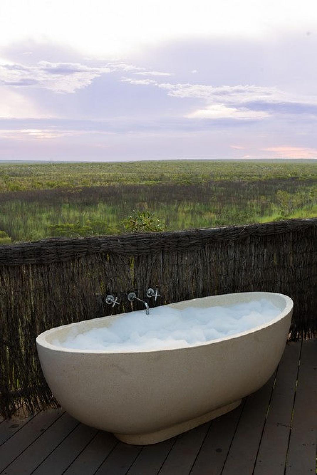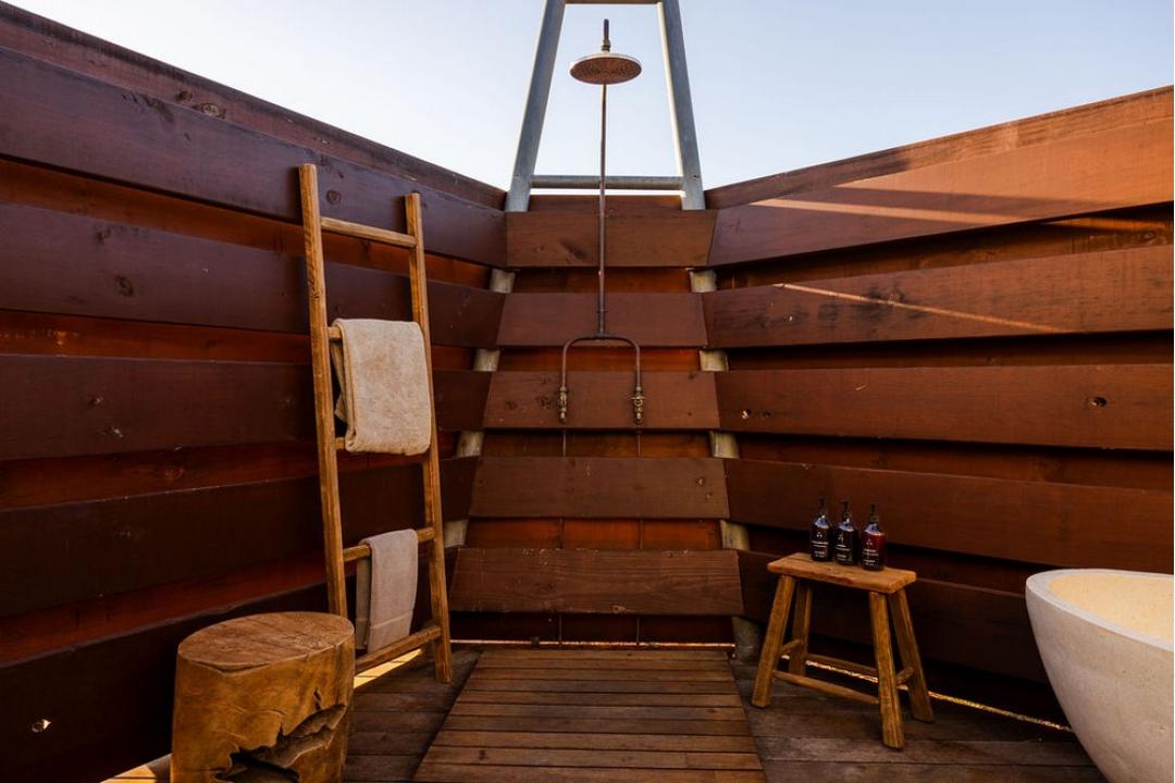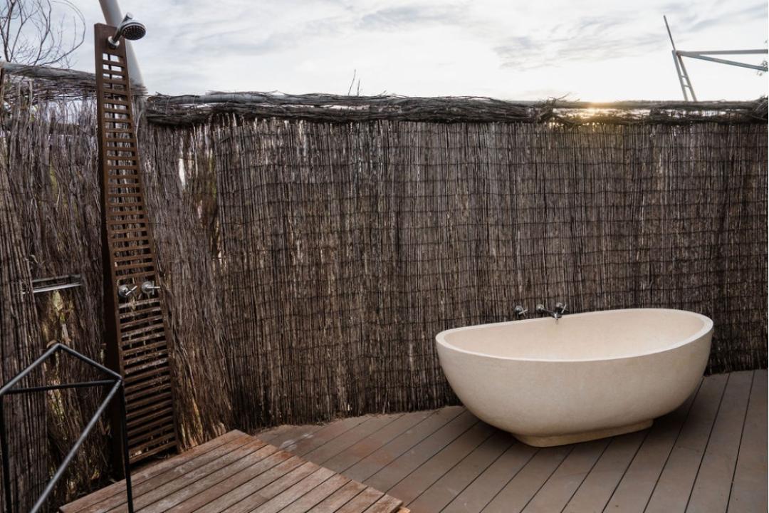 Open-air ensuite featuring a rain shower and freestanding bath beneath the stars