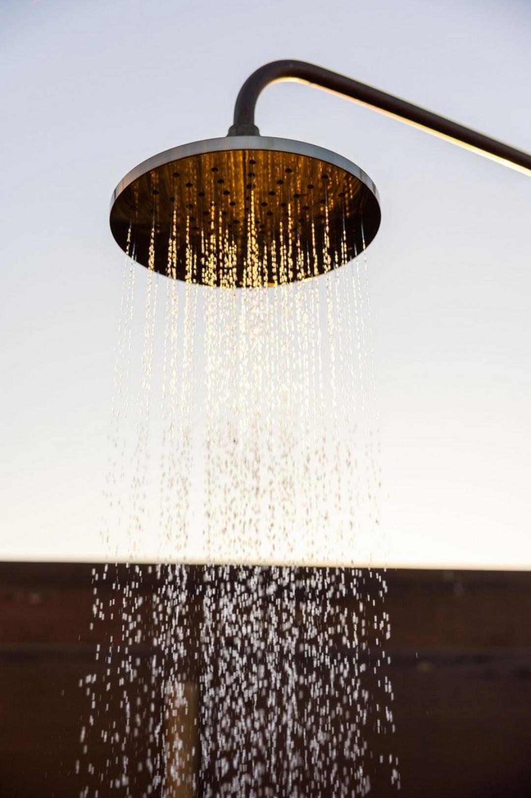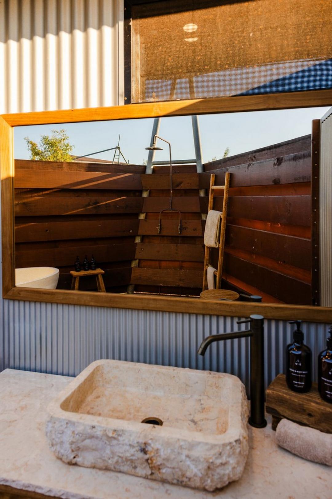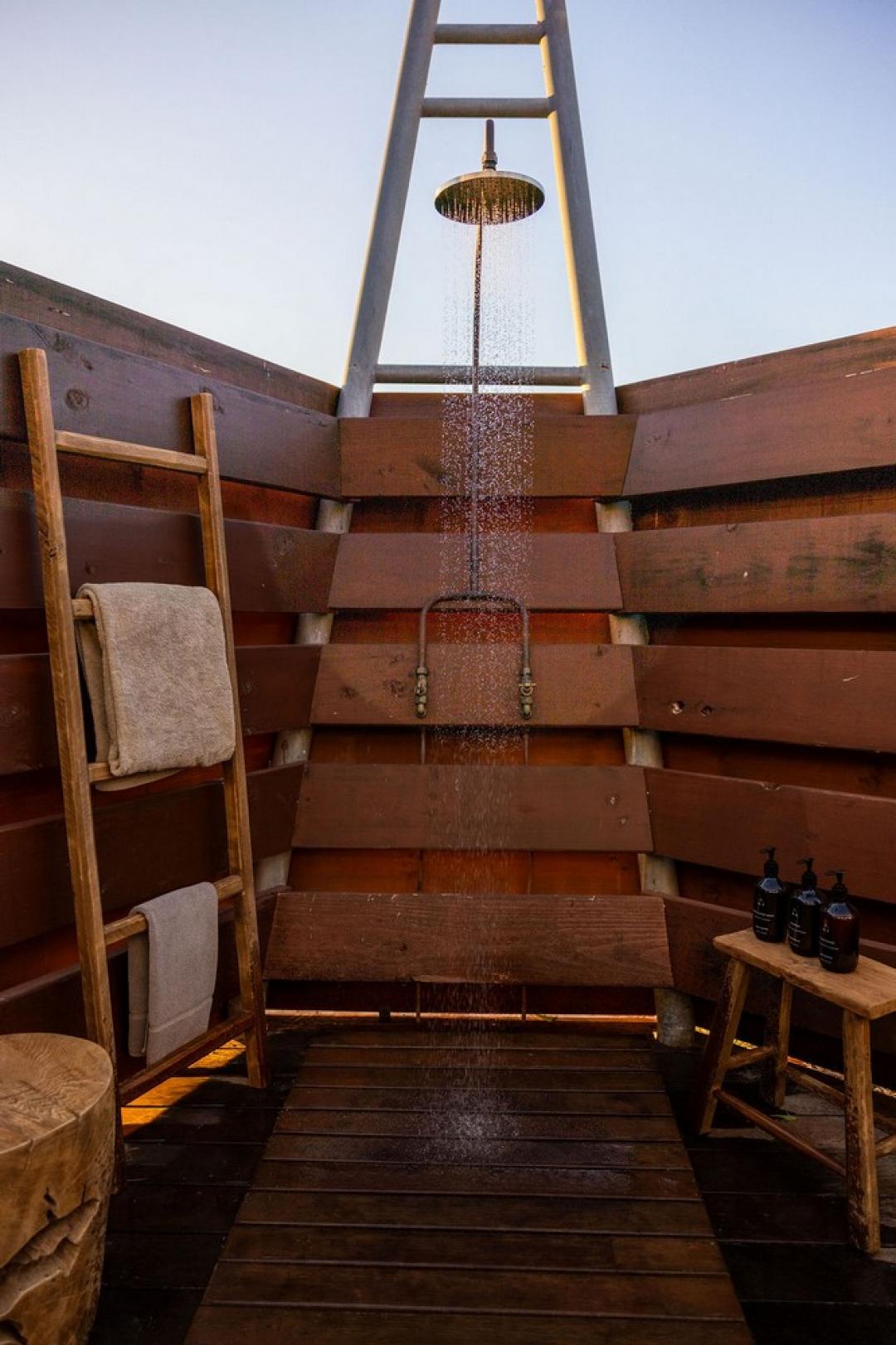 Open-air ensuite featuring a rain shower and freestanding bath beneath the stars